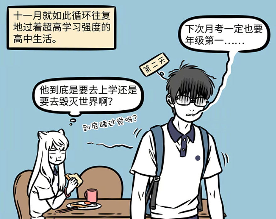 《非人哉》第1135话更新,故事仍旧是十一月的高中时期。因为掉出年级前十,所以十一月变得有点疯狂中岩投资,这一次没有变成美男子,而是变为妖狐形态。为了考到年级第一,十一月每天学习19小时,就想成为年级第一。